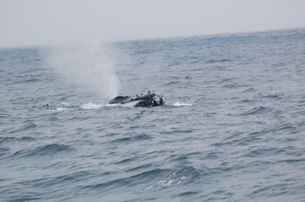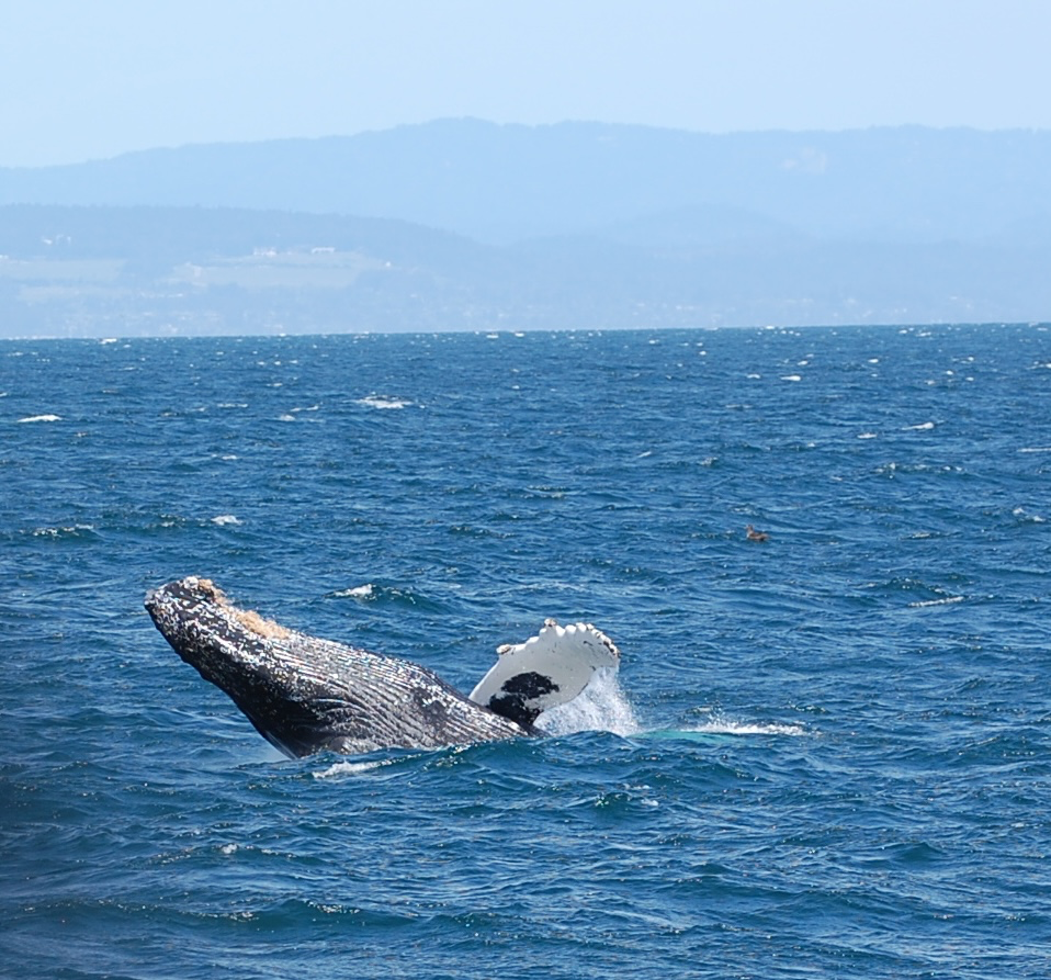 Another amazing behavior is a breach – when a whale hurls itself, either partially, or on rare occasions, entirely, out of the water. There are a lot of theories about why they do this. Some beehive it is a form of communication, since sound of their impact travels a long way through water, others suggest it part of courtship displays or battles for dominance during mating season. And sometimes its a youngster learning and having fun.