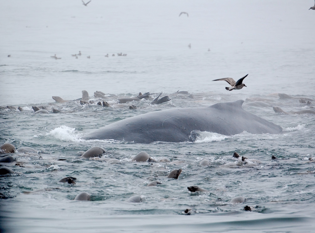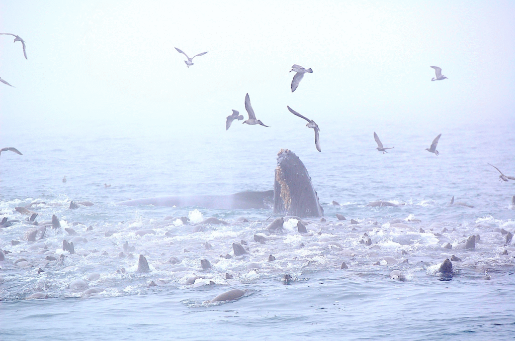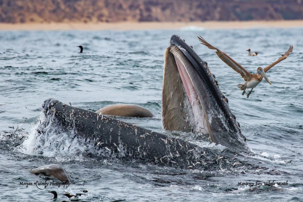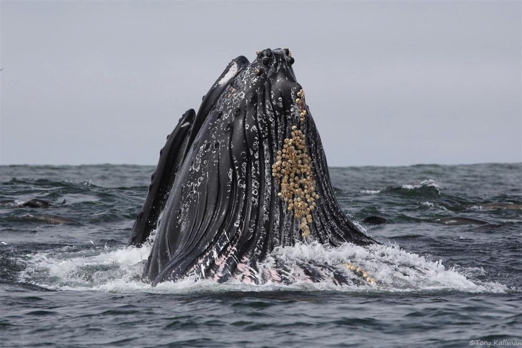 To facilitate their large meals, Humpbacks, and some other large whales, have lines, or pleats, called rorquals, which start near the chin and run down toward their abdomens. As the whale fills their mouth with gallons of fish and water, the pleats spread wide to give them room to hold the volume of water they’ve gulped. Then, as the whale pushes the water out, trapping the fish inside their mouths, the rorquals fold back down against the whale’s body.