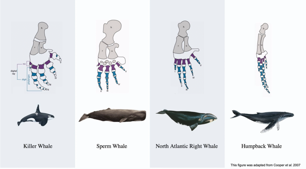 One of the most distinctive things about Humpbacks whales are their pectoral fins. In a Humpback the pectoral fins average fifteen feet, or one third of its body length. These long limbs are usually white with patches of gray, again, color varies from group to group. Pectoral fins are the “arms” of a whale, the bones having adapted over millennia for use in water instead. The trailing edge of a Humpback’s pectoral fin has a row of tubercles which allow the whale a great deal of control as they turn and move through the water. The fins’ size and weight also makes them powerful weapons, along with its large tail, when fighting off predators.