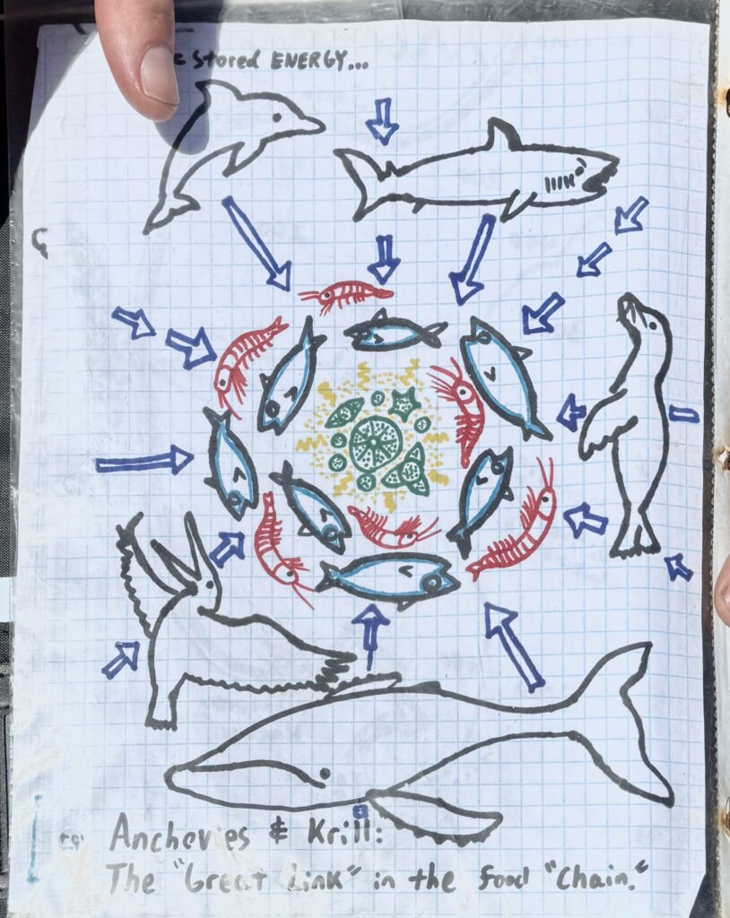 Isaiah also shared an image he’d drawn of the marine food web in radiating circles from zooplankton in the center up/out to the large whales.