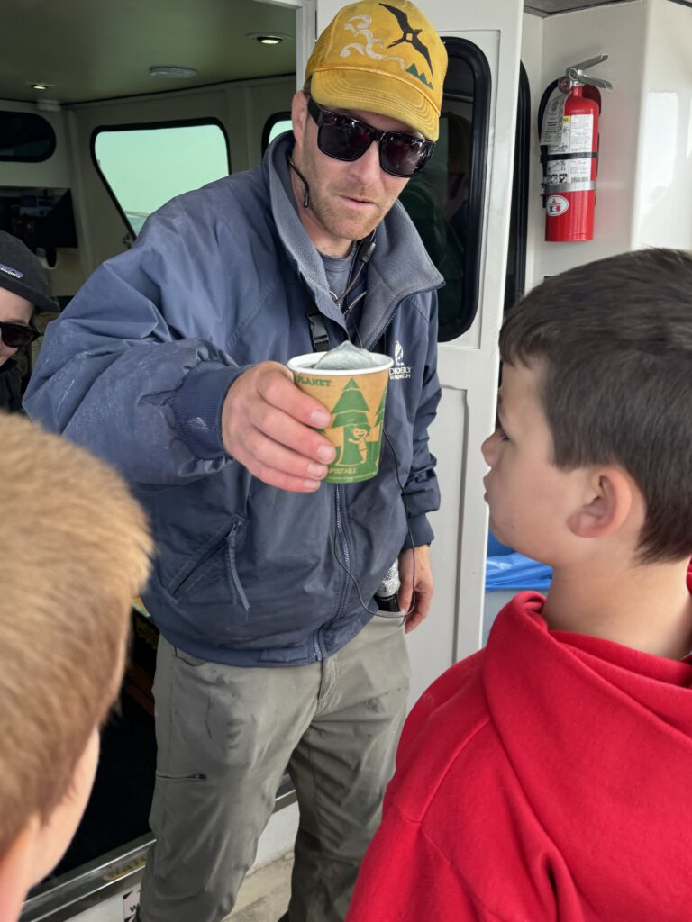As we traveled our Naturalist, Isaiah, noted that there was a lot of Krill in the bay of late, and he pointed out some clear patches of them on the surface. He dropped a bucket in the water and scooped up a few Krill to show us. Krill are very small and light in color making it hard to distinguish individuals within the school they were part. Even in the bucket they weren’t super easy to spot – but it was easier.